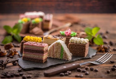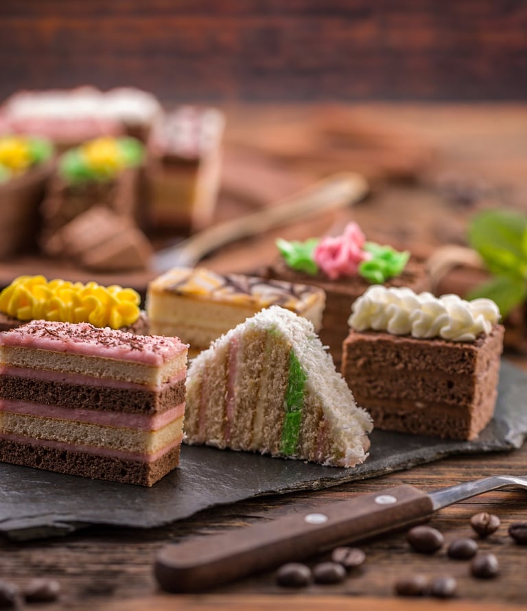 A plate filled with freshly baked pastries and colorful homemade desserts on a rustic wooden table.